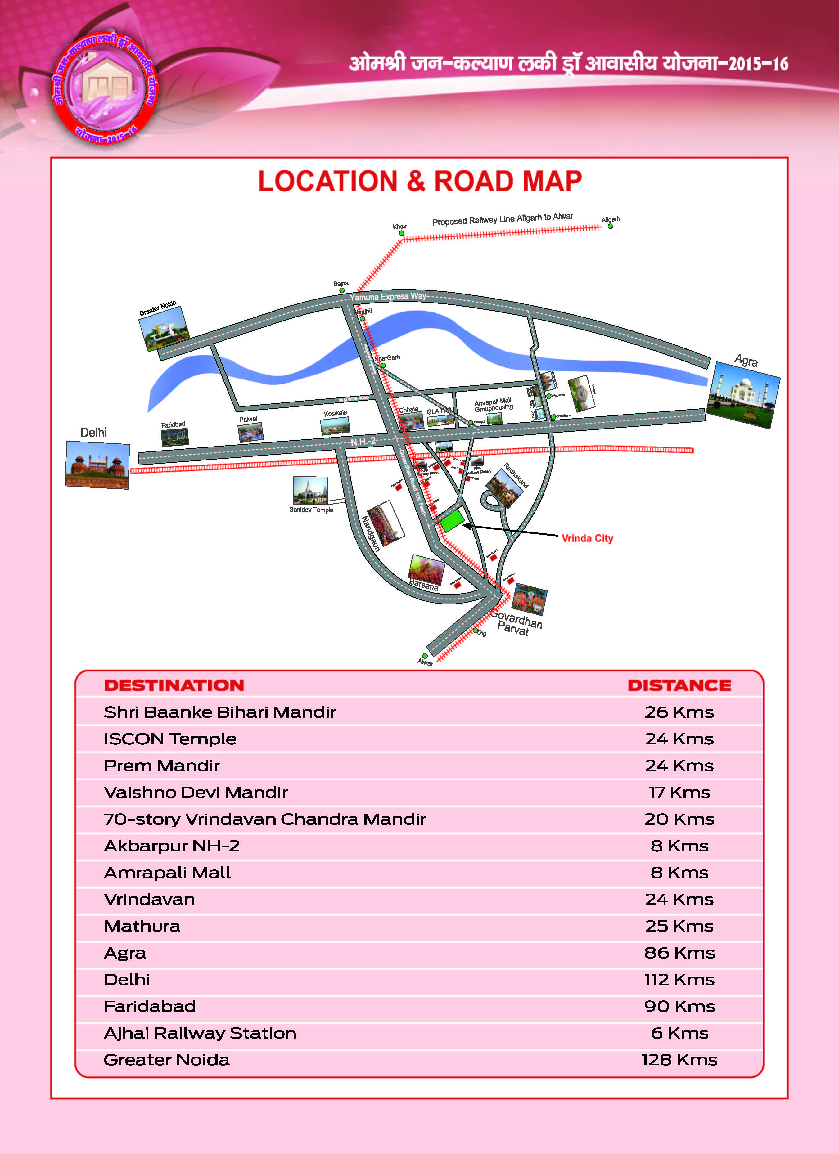 Very near to Lord Krishna's Baanke Bihari Temple. Prem mandir, ISCON Temple, Vaishno Devi emple, etc where peace is everywhere. World largest 70 story temple "shri Vrindravan Chandra Mandir" is located near city. College, institute, mall, hospital, group housing and many more facilities are available inside city like roads, parks, commercial shops, temples etc.